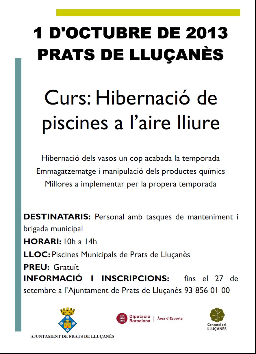 | Descripció: | Curs de manteniment d'instal.lacions esportives, concretament per a la hibernació de piscines a l'aire lliure.