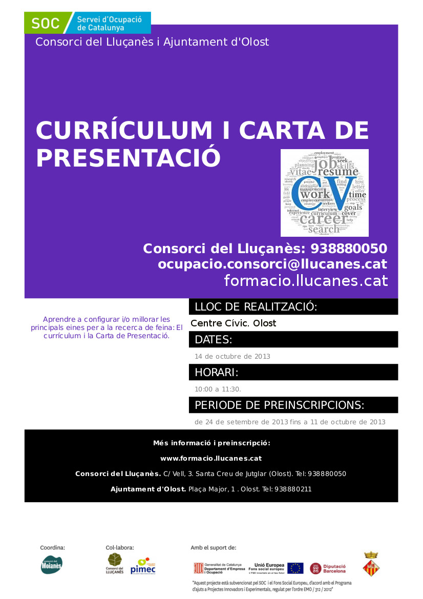 | Destinataris/es: | Persones en situació de Recerca o Millora de Feina. Cal estar inscrits al SOC i portar el document DARDO i DNI |